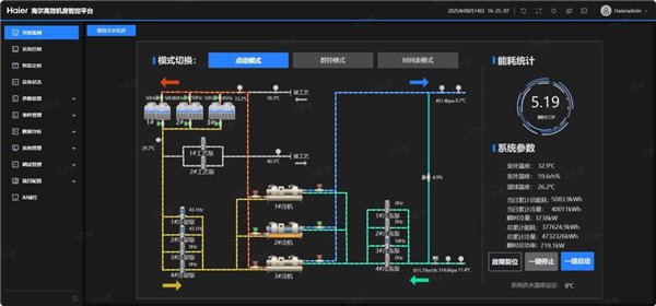不同于行业单点节能改造,海尔通过 BMS 系统整合水机、模块机及末端智控系统,打通数据壁垒,实现全流程联动,大幅降低集成成本。同时,依托 AI 算法的高效机房能动态优化运行参数,磁悬浮空调主机、冷却塔智能调节,使系统 COP 平均达 5.5,远超传统工业空调低于 3.0 的水平,有效缩短零碳改造回本周期。