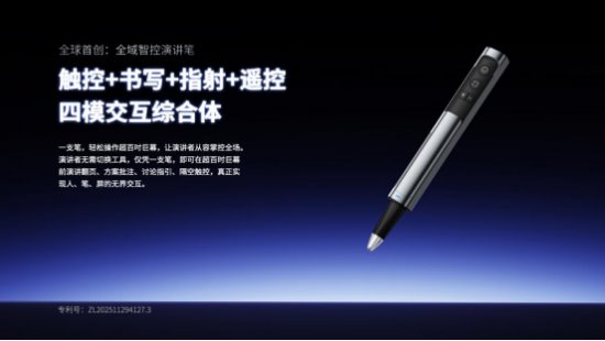成者 AI 激光会议大屏(交互式),标配全域智控演讲笔,以全球独创的“隔空书写”技术,“墙面即界面”,演讲者可以手持一支笔,在会议室任意角落行走、行至屏幕前,无需接触任何实物,直接用笔在投射出的任意画面上(PPT、视频、网页)进行悬浮批注、书写。